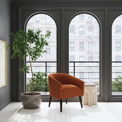This Printers Chair in Textured Linen from Threshold™ adds artful mid-century elegance to your space. This armed accent chair has a padded seat and a crescent-curved back for comfy seating, and it’s covered in a solid-colored linen-like fabric to add depth and refinement to your decor. Featuring a hardwood frame and standing on splayed black-finish legs, the upholstered chair can be placed anywhere in your home to add a functional and stylish accent.